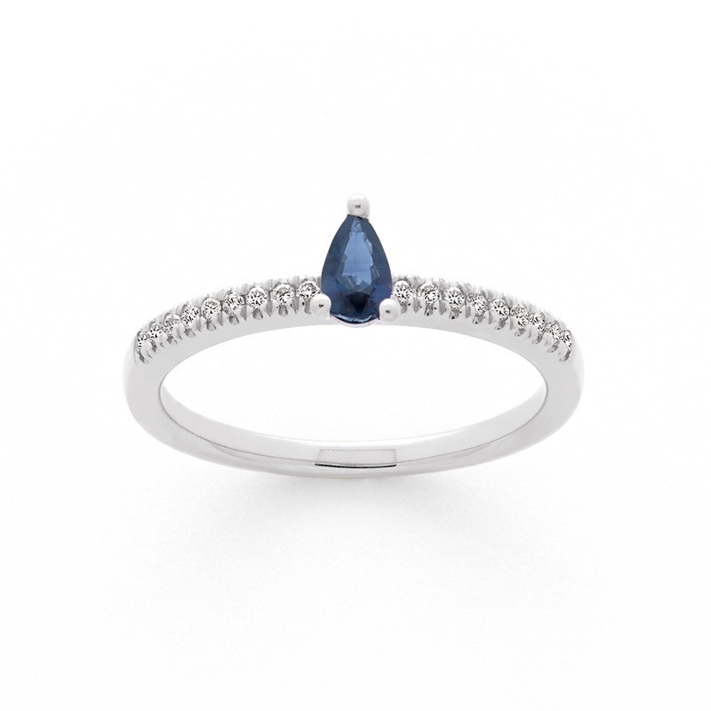 Bague Saphir 0,27 carat taille poire épaulement Diamants 0,09 carat Or blanc